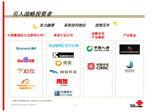 投資公司的發(fā)布也有差異,香港交易所上的公告顯示,新引入的戰(zhàn)略投資者為中國人壽、騰訊信達、百度鵬寰、京東三弘、阿里創(chuàng)投、蘇寧云商、光啟互聯(lián)、淮海方舟、興全基金和結構調整基金;而在聯(lián)通香港官網上的公告中,除了大型互聯(lián)網公司名單不變,還有滴滴、網宿科技、用友、宜通世紀等公司。