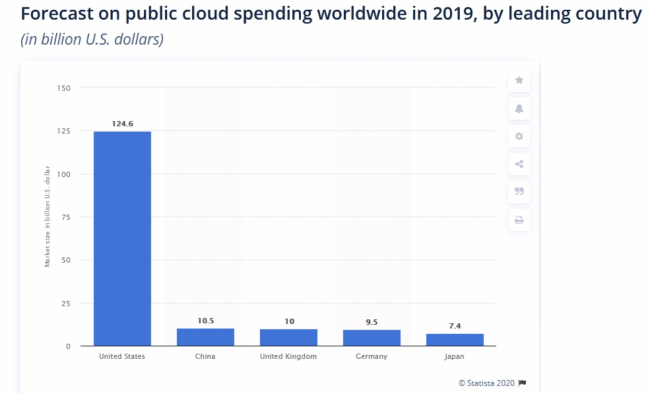 此外,根據(jù)美國(guó)國(guó)家軟件與服務(wù)公司協(xié)會(huì)(NASSCOM)在2019年的報(bào)告,中國(guó)的IT支出僅占該國(guó)GDP的1.4%,而其IT總支出中只有2.7%用于云服務(wù)。與此相比,美國(guó)是世界上最大的云市場(chǎng),其IT支出占其GDP的4.7%,其中11.4%用于公共云服務(wù)。