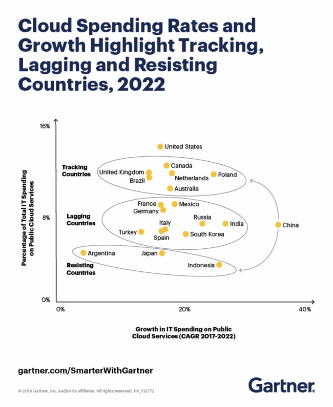 這表明中國(guó)云市場(chǎng)潛力巨大。Gartner指出,在云市場(chǎng)方面,中國(guó)是落后國(guó)家(落后于美國(guó)四年或更長(zhǎng)時(shí)間)。然而,中國(guó)市場(chǎng)發(fā)展較快,到2023年之后,中國(guó)落后美國(guó)將不到三年。