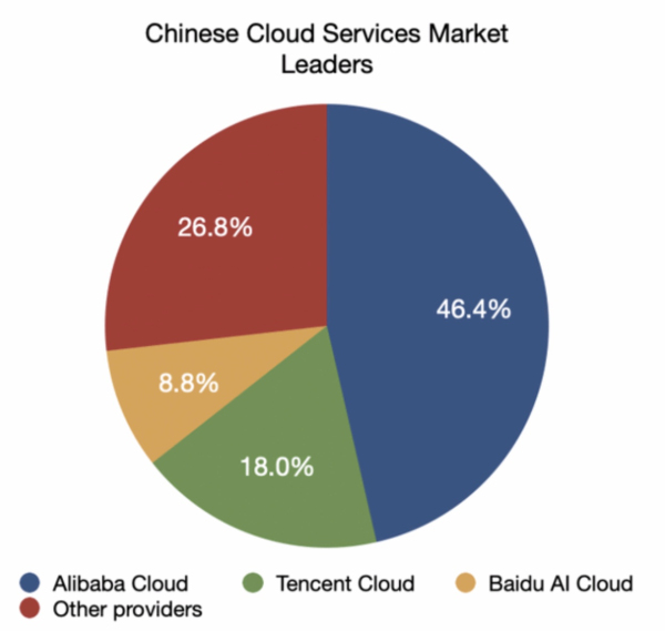 根據(jù)Canalys的數(shù)據(jù),阿里云、騰訊云和百度云是中國(guó)三大云公司,合計(jì)占據(jù)了三分之二的市場(chǎng)。其中,阿里巴巴占據(jù)了46.4%的市場(chǎng)份額,是市場(chǎng)領(lǐng)導(dǎo)者。