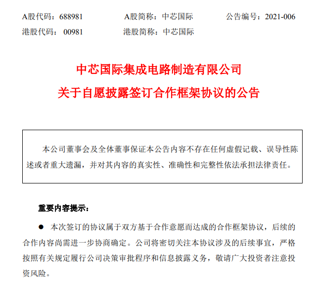 ICC訊 (編輯:Nicole) 3月18日消息,中芯國(guó)際集成電路制造有限公司(以下簡(jiǎn)稱“中芯國(guó)際”或“本公司”)公告稱:本公司于本公告日期簽訂由深圳政府于2021年3月12日同意的合作框架協(xié)議。根據(jù)合作框架協(xié)議,本公司和深圳政府(透過深圳重投集團(tuán))(其中包括)擬以建議出資的方式經(jīng)由中芯深圳進(jìn)行項(xiàng)目發(fā)展和營(yíng)運(yùn)。