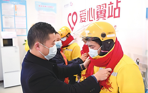 ICC訊 12月4日,中國(guó)電信江蘇淮安分公司清江浦北分局水渡支局“愛(ài)心翼站”的志愿者,向外賣小哥推薦為他們量身打造的騎士卡套餐,并向在寒風(fēng)中騎行的他們贈(zèng)送耳護(hù)、手套、護(hù)膝、圍巾等“暖心禮品”,讓他們?cè)诤涞亩崭惺艿揭唤z溫暖。