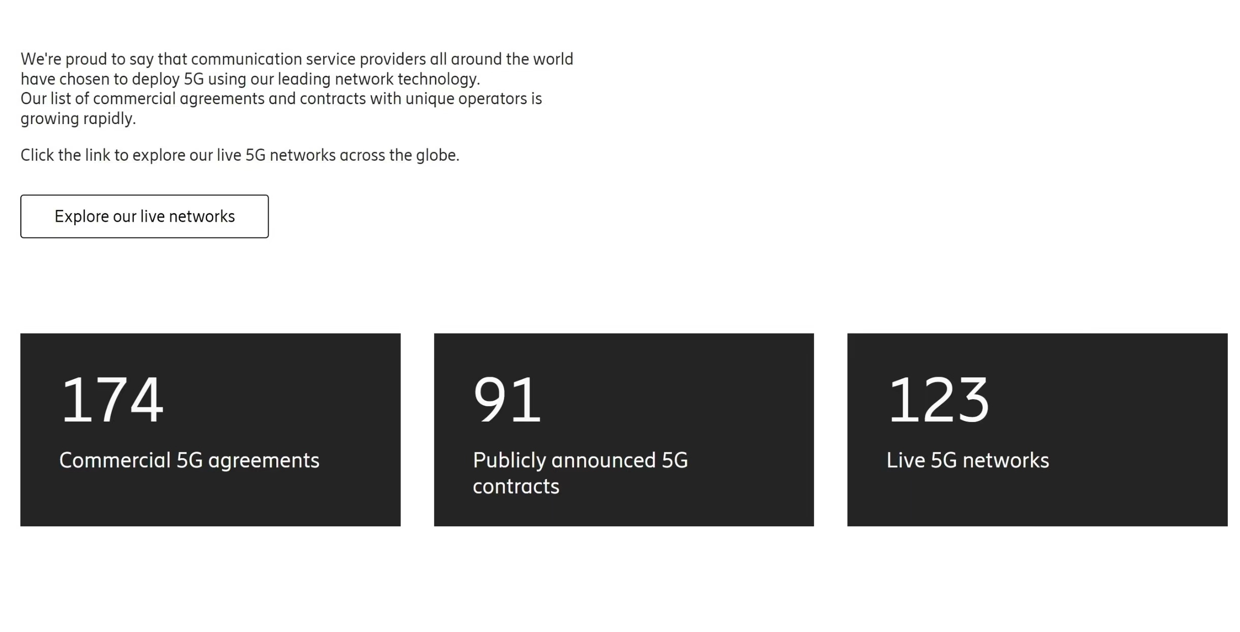 ICC訊  愛立信官網(wǎng)公布的最新數(shù)據(jù)顯示:目前,愛立信已經(jīng)在全球獲得174個(gè)5G商用合同,其中愛立信已經(jīng)與91家運(yùn)營商客戶達(dá)成可公示的5G商用合同,目前在55個(gè)國家為123個(gè)已經(jīng)正式運(yùn)行的5G商用網(wǎng)絡(luò)提供設(shè)備。