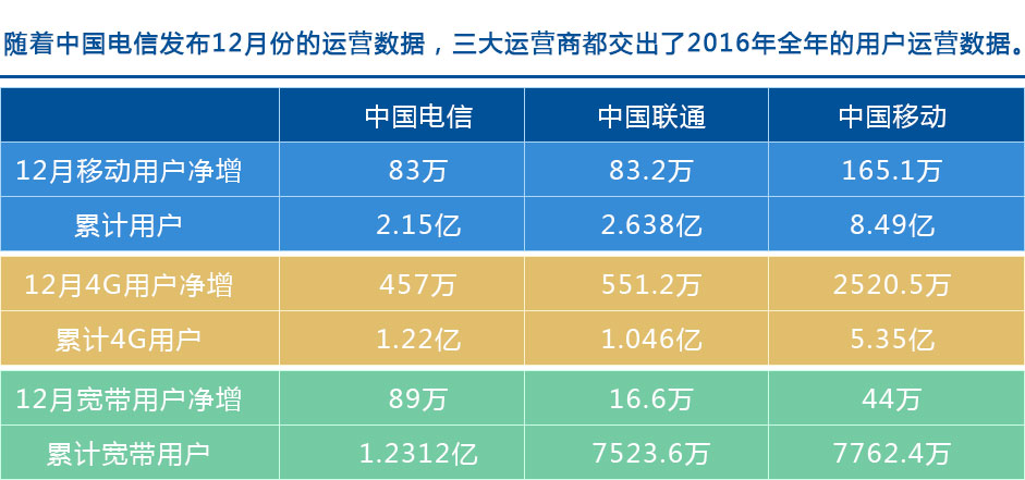 ICCSZ訊 隨著中國電信發(fā)布12月份的運(yùn)營數(shù)據(jù),三大運(yùn)營商都交出了2016年全年的用戶運(yùn)營數(shù)據(jù)。