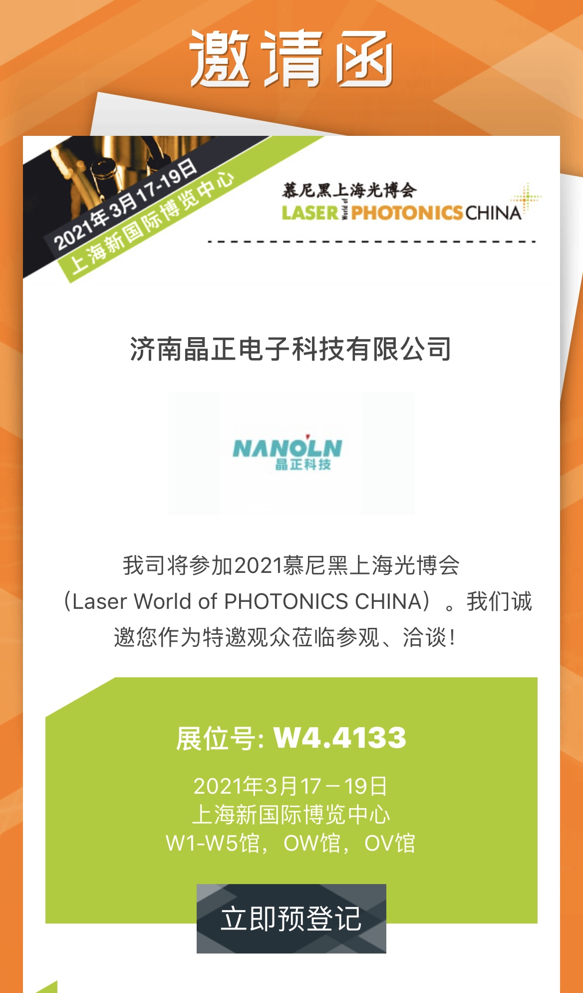 ICC訊 2021慕尼黑上海光博會將于3月17-19日在上海新國際博覽中心舉行,濟(jì)南晶正電子科技有限公司將參展慕尼黑上海光博會。展位號為W4館4133。期待各位客戶蒞臨參觀、洽談!