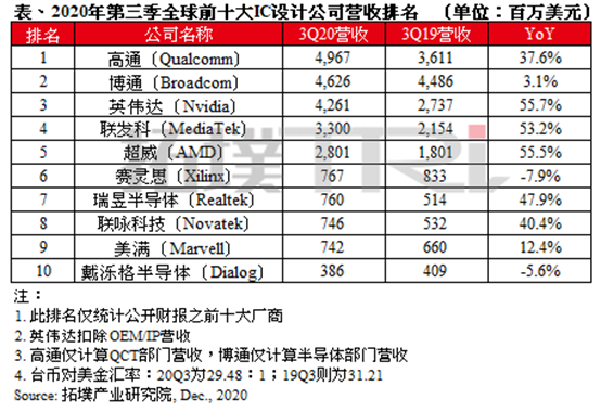 拓墣表示,高通受益于蘋果公司的iPhone 12的暢銷,基帶與無線射頻芯片需求大幅上升,第三季度營(yíng)收49.67億美元,同比增長(zhǎng)37.6%,反超博通,位居第一。