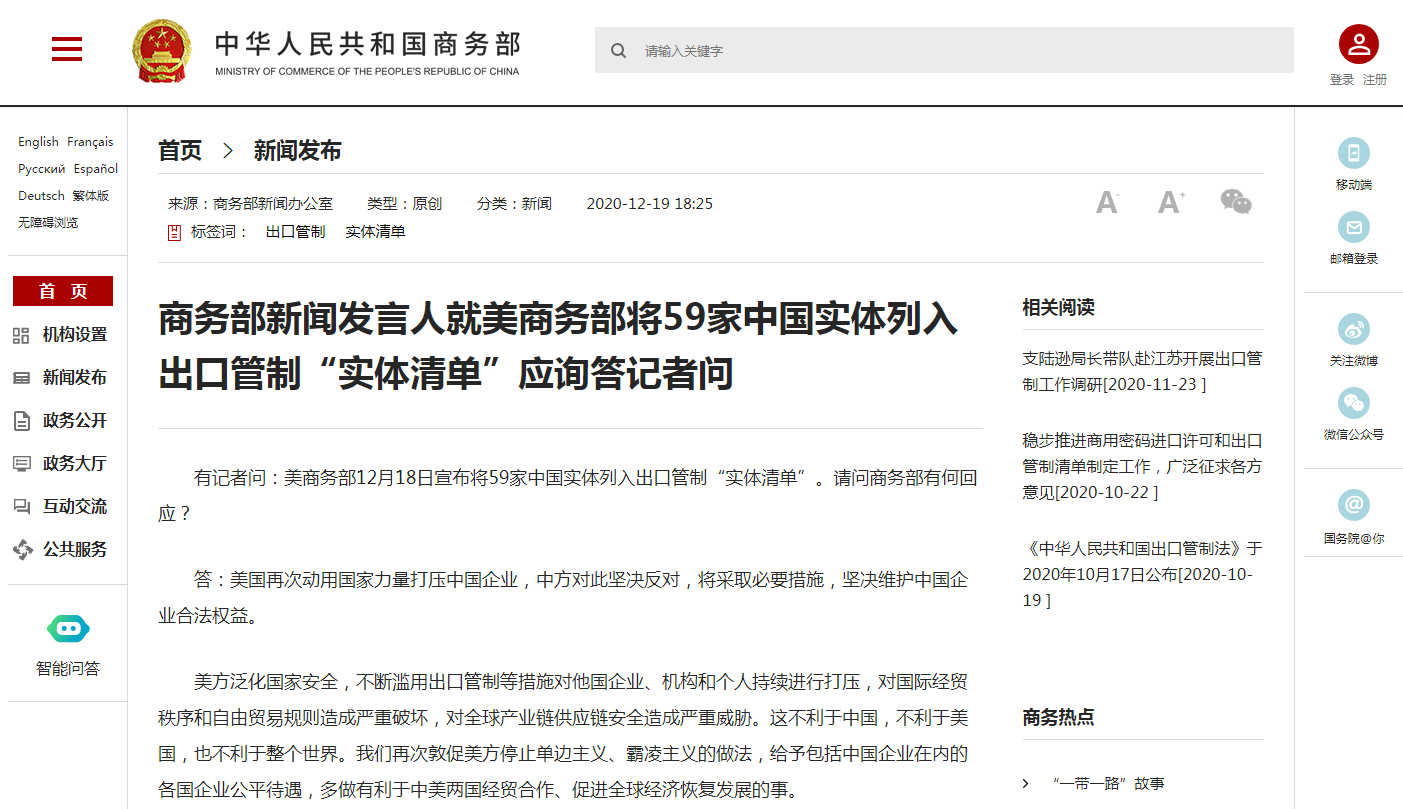 有記者問:美商務(wù)部12月18日宣布將59家中國實體列入出口管制“實體清單”。請問商務(wù)部有何回應(yīng)?