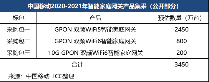 根據(jù)招標(biāo)公告,中國(guó)移動(dòng)2020-2021年智能家庭網(wǎng)關(guān)產(chǎn)品集采項(xiàng)目共劃分3個(gè)采購(gòu)包,分別為采購(gòu)包一GPON-雙頻WiFi5智能家庭網(wǎng)關(guān)2450萬(wàn)臺(tái),采購(gòu)包二GPON-雙頻WiFi6智能家庭網(wǎng)關(guān)800萬(wàn)臺(tái),采購(gòu)包三10G GPON-雙頻WiFi6智能家庭網(wǎng)關(guān)200萬(wàn)臺(tái)。