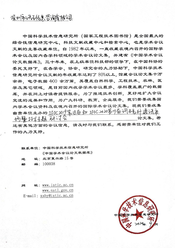 ICC訊(編輯:Cecilia) 2020年9月,中國科學技術信息研究所(國家工程技術圖書館)正式將IFOC 第18屆、第19屆《訊石光纖通訊市場暨技術專題研討會論文集》納入館藏。