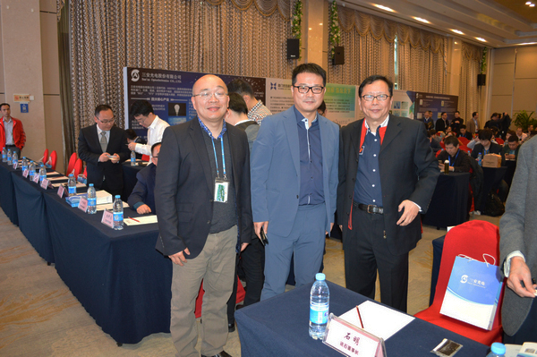 三安光技術(shù)事業(yè)部負責(zé)人鄭文(左)、三安股份總經(jīng)理林科闖(中)、訊石董事長石明(右)