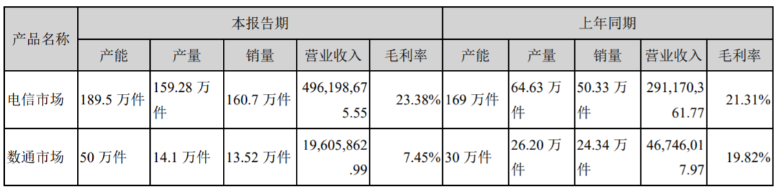 從電信市場(chǎng)、數(shù)據(jù)通信市場(chǎng)銷(xiāo)售方面來(lái)看,報(bào)告期內(nèi),電信運(yùn)營(yíng)商大力升級(jí)光纖傳輸網(wǎng),帶動(dòng)了DWDM器件銷(xiāo)售增長(zhǎng),同時(shí)繼續(xù)加大10G PON網(wǎng)絡(luò)建設(shè)投入,促進(jìn)了PON光模塊銷(xiāo)售增長(zhǎng)。2021年上半年,公司電信市場(chǎng)業(yè)務(wù)實(shí)現(xiàn)銷(xiāo)售收入4.96億元,比上年同期增長(zhǎng)70.42%,占總銷(xiāo)售收入的96.20%。境內(nèi)外互聯(lián)網(wǎng)企業(yè)數(shù)據(jù)中心建設(shè)持續(xù)投入,但受市場(chǎng)價(jià)格降低等因素影響,2021年上半年公司數(shù)通市場(chǎng)業(yè)務(wù)實(shí)現(xiàn)銷(xiāo)售收入0.20億元,比上年同期下降58.06%,占總銷(xiāo)售收入的3.80%。