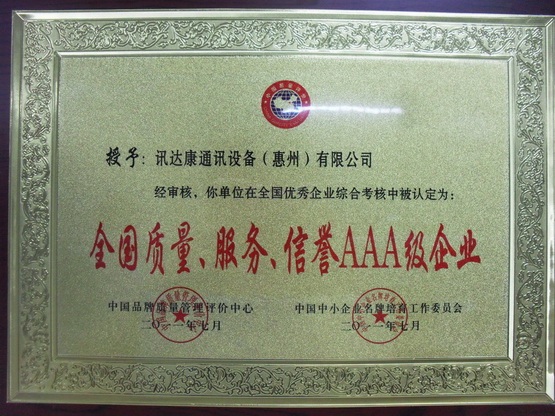 訊達(dá)康通訊設(shè)備(惠州)有限公司被中國品牌質(zhì)量管理評(píng)價(jià)中心、中國中小企業(yè)名牌培育工作委員會(huì)認(rèn)定為AAA級(jí)企業(yè)。
