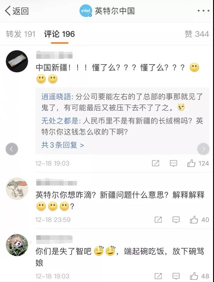 在英特爾禁用新疆產(chǎn)品的消息傳出后,中國(guó)網(wǎng)友紛紛涌入英特爾官方微博賬號(hào)下方質(zhì)問(wèn)該公司: