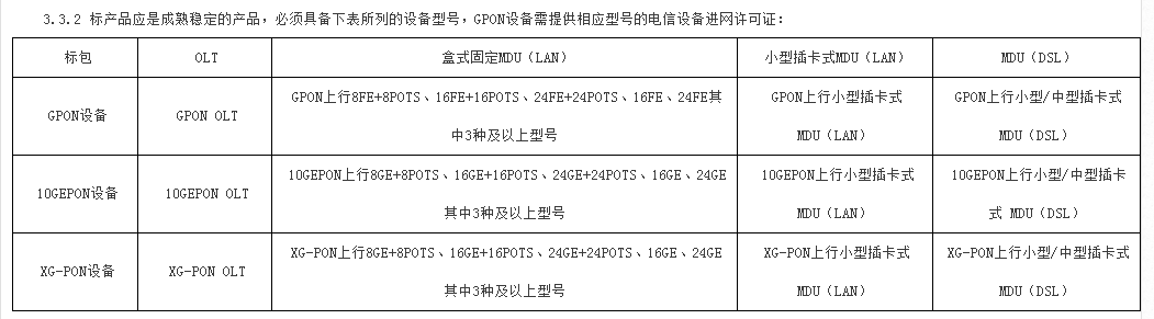 (3) XG-PON設(shè)備產(chǎn)品應(yīng)在國(guó)內(nèi)電信運(yùn)營(yíng)商或具有跨省互聯(lián)網(wǎng)絡(luò)的大型互聯(lián)網(wǎng)企業(yè)有不少于1年的商用經(jīng)驗(yàn),要求必須同時(shí)具備XG-PON OLT、XG-PON MDU設(shè)備。