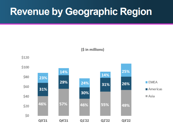 按區(qū)域劃分, 2022 年第三季度DZS在美洲地區(qū)的收入,同比增長1.12%,達到 2760.9萬美元。歐洲、中東和非洲地區(qū)的收入同比增長30.5%,至 2659.5萬美元。在過去兩年里,約75%的新客戶來自北美和EMEA。亞洲地區(qū)的收入同比增長 30.6%,達到 5319萬美元。