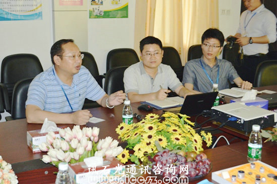 訊石與奧鑫通訊總經理智健和副總經理杜永建,銷售經理陳順基在洽談中
