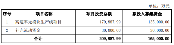 根據(jù)3月6日,新易盛披露的2020年度非公開發(fā)行股票預(yù)案,擬非公開發(fā)行股票預(yù)計募集資金總額不超過 16.5億元(含),扣除發(fā)行費用后的募集資金凈額將用于高速率光模塊生產(chǎn)線項目13.5億元和補充流動資金3億元。