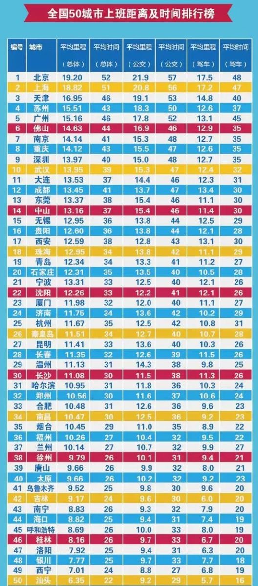 北上廣深四大一線城市的上班距離及用時(shí)均名列前十。北京以平均通勤時(shí)間52分鐘,距離19.2公里居首;上海以平均距離18.82公里、用時(shí)51分鐘排行第二,調(diào)查還顯示,北京市是居住區(qū)域和辦公區(qū)域分割最明顯的城市,對(duì)此,不少網(wǎng)友吐槽其為“通勤之最”。