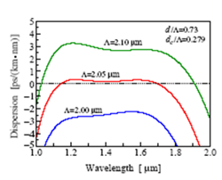 改變光子晶體光纖中的空氣孔大小與間距,光子晶體光纖的色散和色散斜率會(huì)急劇變化。如實(shí)心光纖的零色散點(diǎn)在1300nm波長(zhǎng)附近,也可以通過(guò)設(shè)計(jì)將零色散點(diǎn)向長(zhǎng)波長(zhǎng)移動(dòng),但是難以獲得短波長(zhǎng)的零色散。光子晶體光纖就可以實(shí)現(xiàn)傳統(tǒng)實(shí)心光纖無(wú)法實(shí)現(xiàn)的短波長(zhǎng)零色散特性、寬波段的色散平坦特性(如圖2),以及超大負(fù)色散特性。
