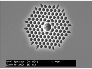 光子晶體光纖的結(jié)構(gòu)與常規(guī)光纖迥然不同,普通的光纖是由實(shí)體的纖芯和包層構(gòu)成的,而光子晶體光纖的包層由空氣孔和石英構(gòu)成,空氣孔在纖芯的外圍以正六邊形的樣子規(guī)則排列。石英-空氣復(fù)合結(jié)構(gòu)的光子晶體光纖大折射率反差、高度可控制的周期性折射率變化,為光的傳導(dǎo)與控制提供了新的機(jī)理及途徑。光子晶體光纖具有許多獨(dú)特而神奇的物理特性:可控的非線性、無(wú)盡單模特性、可調(diào)節(jié)的奇異色散、低彎曲損耗、大模場(chǎng)等,這些特性是常規(guī)石英單模光纖很難或無(wú)法實(shí)現(xiàn)的,因此,光子晶體光纖引起了科學(xué)工作者的濃厚興趣,并開(kāi)展了深入的理論與試驗(yàn)研究。