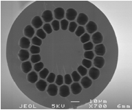 更為神奇的是,光子晶體光纖還有一神奇的“變種”。如果去除光子晶體光纖的實(shí)心纖芯,換成“空心”就形成了類似于宇宙“蟲(chóng)洞”的時(shí)光隧道,大大減小了光纖傳輸?shù)姆蔷€性效應(yīng)、色散和損耗,可用于大功率激光傳輸、新型通信及光纖傳感,圖4是一種空心帶隙型光子晶體光纖。