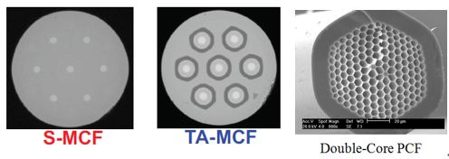 光子晶體光纖具有靈活的空間排布工藝技術(shù),可利用光子晶體復(fù)用光纖技術(shù)制造空分多芯光纖,如雙芯光纖、7芯光纖、19芯光纖等(如圖7)。Jun Sakaguchi等利用長(zhǎng)16.8km的7芯光纖、97路100GHz間隔的WDM波分復(fù)用通道、2路PDM傳輸86-Gb/s的QPSK信號(hào),總速率達(dá)到109Tb/s。7芯光纖傳輸串?dāng)_很低,可以忽略不計(jì)。該實(shí)驗(yàn)首次突破了以往100Tbit/s的單纖傳輸容量限制,打破了原有的世界紀(jì)錄,顯現(xiàn)出作為未來(lái)大容量傳輸媒質(zhì)的多芯光纖巨大潛力。該研究團(tuán)隊(duì)采用19芯光纖傳輸高達(dá)305TB/s的信號(hào)。