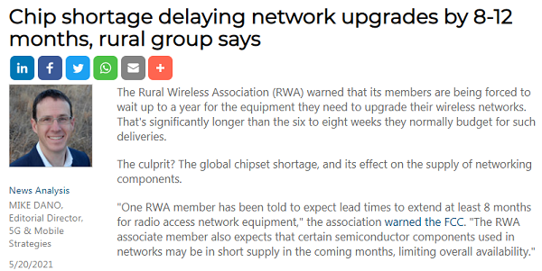該協(xié)會警告FCC:“一位RWA成員被告知,無線接入網(wǎng)絡(luò)(RAN)設(shè)備的交貨時間預(yù)計將至少延長8個月。該RWA協(xié)會成員還預(yù)計,未來幾個月,網(wǎng)絡(luò)中使用的某些半導(dǎo)體組件可能會供不應(yīng)求,從而限制了整體可用性?!?