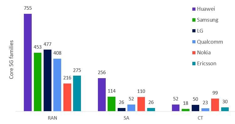 在技術領域分布方面,華為在RAN TSG的5G核心標準必要專利持有量遠高于其他公司,在SA TSG和CT TSG領域的5G核心標準必要專利持有量也名列前茅。具體到工作組中,華為在R1、R2、R3、C4、S2、S3和S5等多個工作組中均擁有最多的5G核心專利族。