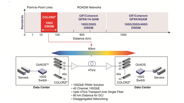 IPoDWDM將光模塊插入路由器端口,使路由器能夠直接相互連接,而無需插入光學(xué)轉(zhuǎn)發(fā)器。 COLORZ QSFP28光學(xué)收發(fā)器是第一個(gè)面向數(shù)據(jù)中心互連應(yīng)用的市場。 OcNOS是Open Compute硬件的企業(yè)級和運(yùn)營商級網(wǎng)絡(luò)操作系統(tǒng)。 它已經(jīng)在許多數(shù)據(jù)中心互連應(yīng)用中得到采用,包括Telecom Infra Project內(nèi)的Cassini白盒數(shù)據(jù)包轉(zhuǎn)發(fā)器。