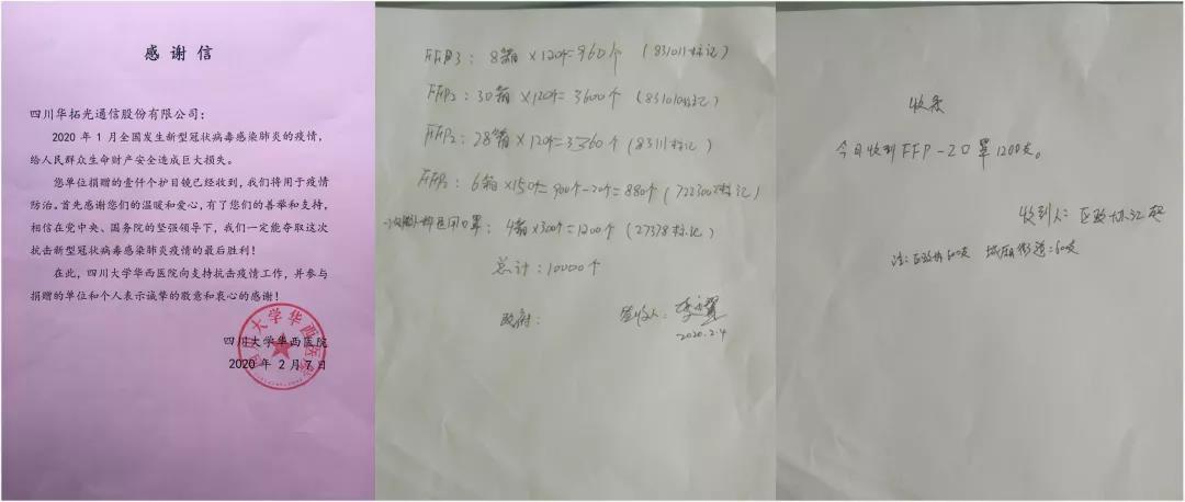 在口罩、護(hù)目鏡等防護(hù)物資運(yùn)抵回國之后,我司第一時(shí)間安排將這些物資捐獻(xiàn)給需要的單位和企業(yè)。其中,向綿陽市涪城區(qū)政府共計(jì)捐贈(zèng)口罩約1.3萬只、向四川大學(xué)華西醫(yī)院捐贈(zèng)護(hù)目鏡1000副,后續(xù)公司還將給合作的供應(yīng)商捐贈(zèng)所需物資,提供支援。我司表示,面對(duì)嚴(yán)重疫情,華拓及全體員工有責(zé)任貢獻(xiàn)一份力量,充分發(fā)揮我司全球優(yōu)勢(shì),力所能及協(xié)調(diào)各方資源,為奮戰(zhàn)在防控一線的工作人員提供必要的防護(hù)物資,用實(shí)際行動(dòng)支持抗擊新型冠狀病毒感染肺炎疫情防控救治工作。