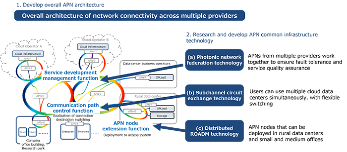 在超越5G/6G時(shí)代,社會(huì)信息化將進(jìn)一步加速,需要大量的信息處理。對(duì)APN的需求正在增長(zhǎng),因?yàn)轭A(yù)計(jì)對(duì)現(xiàn)有信息和通信系統(tǒng)的傳輸能力的進(jìn)一步擴(kuò)大和更高的處理速度的需求將增加,以及對(duì)提供碳中和所需的較低功耗的技術(shù)的需求也將增加。在這種情況下,日本的信息和通信委員會(huì)信息和通信技術(shù)小組委員會(huì)的技術(shù)戰(zhàn)略委員會(huì)和該委員會(huì)下成立的全光網(wǎng)絡(luò)共同基礎(chǔ)設(shè)施技術(shù)工作組就向社會(huì)廣泛提供APN進(jìn)行了討論。因此,“面向超越5G的信息通信技術(shù)戰(zhàn)略”(2024年6月)和“全光子網(wǎng)通用基礎(chǔ)設(shè)施技術(shù)的發(fā)展方向和傳播措施”(2024年5月)的報(bào)告表達(dá)了有必要同時(shí)連接多個(gè)站點(diǎn)并具有提供商之間協(xié)作功能的想法。為了開(kāi)發(fā)這項(xiàng)技術(shù),NICT為“超越5G (6G)基金項(xiàng)目”征求了提案,NTT、KDDI、富士通、NEC和樂(lè)天移動(dòng)共同提交了提案。