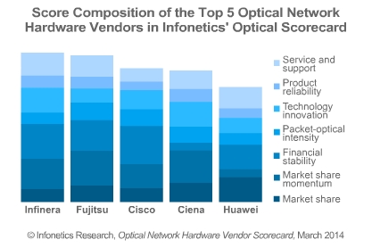 ICCSZ訊 2014年3月26日,市場調(diào)研公司Infonetics發(fā)布其最新的關(guān)于光纖網(wǎng)絡(luò)硬件供應(yīng)商市場調(diào)查報(bào)告,該報(bào)告分析和排名全球前10大光纖傳輸設(shè)備供應(yīng)商:阿朗、Ciena、思科、Coriant、ECI電信、富士通、華為、Infinera、NEC和中興。
