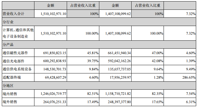 銘普光磁主要生產通信磁性元器件、通信光電部件、通信供電系統(tǒng)設備三大類產品。在2017年度的營業(yè)收入中,通信磁性元器件產品年營收為6.97億元,占年度總營收45.81%,同比增長4.60%;通信光電部件產品年營收6.003億元,占年度總營收39.75%,同比增長1.39%;通信供電系統(tǒng)設備產品年營收1.49億元,占年度總營收9.84%,同比增長9.49%;適配器終端產品年營收6.94千萬元,占年度總營收4.60%,同比增長286.65%。目前,銘普光磁的主要市場在國內,境內銷售額占2017年度總銷售額82.51%。前五名客戶合計銷售金額6.696億元,占年度銷售總額比例44.34%。