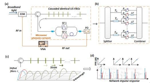 武漢光電國(guó)家實(shí)驗(yàn)室、光學(xué)與電子信息學(xué)院夏歷副教授領(lǐng)導(dǎo)的研究組創(chuàng)新性的提出并驗(yàn)證了一種基于分析微波光子網(wǎng)絡(luò)響應(yīng)的大規(guī)模分布式布拉格光柵光纖傳感網(wǎng)絡(luò)。 整個(gè)光纖傳感網(wǎng)絡(luò)可以被看作是一種多抽頭的微波光子濾波器,并且在解調(diào)端運(yùn)用了平移高斯光學(xué)濾波器的探測(cè)技術(shù),使的通過(guò)分析整個(gè)濾波器的頻率響應(yīng),便可以準(zhǔn)確的探測(cè)出每個(gè)光柵所收到溫度或者應(yīng)力的大小。由于整個(gè)傳感系統(tǒng)運(yùn)用了連續(xù)光而非脈沖光,并且所有光柵采取了獨(dú)特的超短光柵結(jié)構(gòu)使得它們具有很寬的光譜,此種傳感網(wǎng)絡(luò)在接收端可以得到比傳統(tǒng)時(shí)分復(fù)用傳感網(wǎng)絡(luò)大得多的信號(hào)功率。 另外傳感網(wǎng)絡(luò)的靈敏度以及動(dòng)態(tài)范圍還可以通過(guò)簡(jiǎn)單的調(diào)整高斯濾波器之間的中心波長(zhǎng)間距來(lái)隨意的調(diào)節(jié)。 由此可以預(yù)見,這些創(chuàng)新性的設(shè)計(jì)對(duì)于今后構(gòu)建特大規(guī)模的布拉格光柵傳感網(wǎng)絡(luò)具有非常重要的意義。