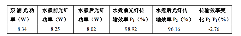 3) 光纖可靠性高,通過采用高可靠性的涂料技術,使得光纖的剝離力在1.6N~3.2N的合適區(qū)間,并通過了嚴苛的高壓水煮實驗(126℃,1.5個大氣壓,24小時)測試包層傳輸效率結果見表2: