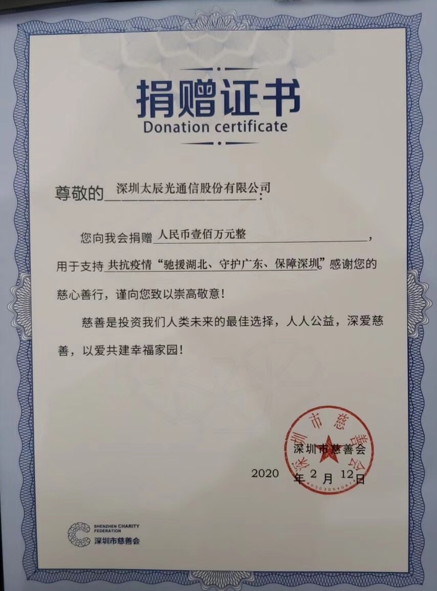 太辰光在確保生產(chǎn)經(jīng)營活動能夠正常開展的同時,積極履行上市公司社會責(zé)任,支持新型冠狀病毒肺炎疫情防控工作。經(jīng)全體董事商討,公司決定代表全體股東及員工向深圳市慈善會捐贈 100 萬元,專項用于新型冠狀病毒肺炎疫情防控工作。