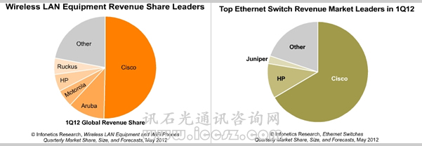 無線LAN設(shè)備領(lǐng)先者思科在2012 Q1市場份額有所增長,Aruba亦保持增長且位居第二,摩托羅拉稍微領(lǐng)先惠普,Ruckus保持第五的位置。