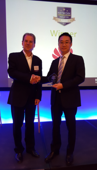 華為全球技術(shù)服務(wù)部NFV集成服務(wù)總經(jīng)理翟忠誠(chéng)(右)領(lǐng)獎(jiǎng)