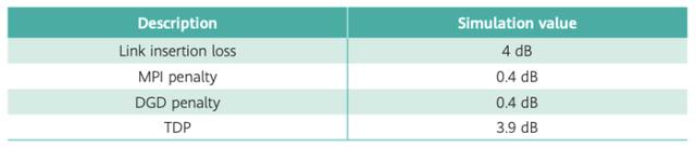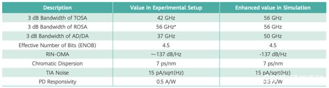 MSA利用仿真和實驗,提出了單通道200G的鏈路性能。如下表列出了鏈接中所采用器件的參數(shù)。