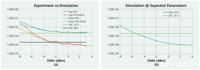 上圖(a)中的虛線顯示基于采用實驗中使用器件的測量參數(shù)仿真的結(jié)果。結(jié)合實驗結(jié)果,仿真表明,該系統(tǒng)受AD/DA、驅(qū)動器和E/O調(diào)制器等元件帶寬的限制。考慮到未來幾年有望提供更高帶寬的組件,并基于同一系統(tǒng)模型(帶寬擴展)的仿真結(jié)果上圖(b)所示。結(jié)果表明,DSP單元中只有FFE均衡,就可以滿足接收機靈敏度2E-3的要求,符合理論預(yù)期。
