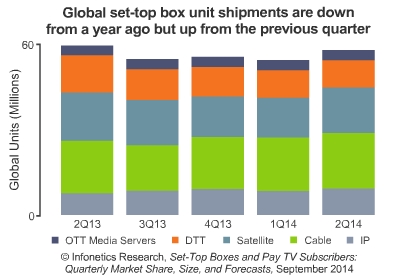 ICCSZ訊 日前,市場(chǎng)調(diào)研公司Infonetics發(fā)布其最新的關(guān)于機(jī)頂盒和付費(fèi)電視的市場(chǎng)報(bào)告,該報(bào)告主要涉及IP、有線、衛(wèi)星電視、數(shù)字地面(DTT)機(jī)頂盒(STB),以及OTT市場(chǎng)。