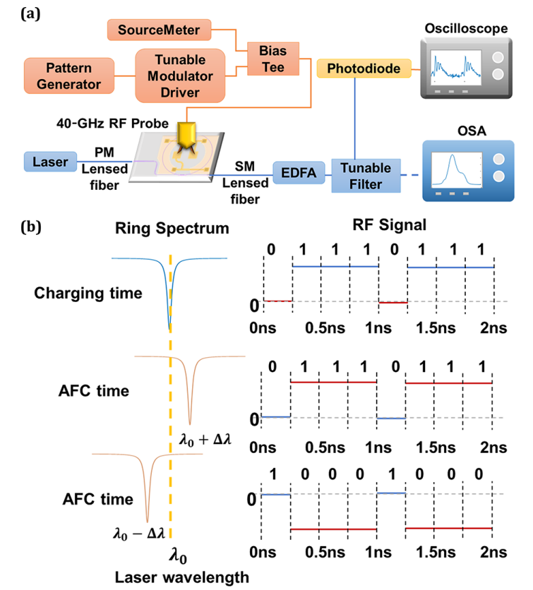 作者通過在 4 GHz 的頻率處使用 6.5 V 的RF控制驅(qū)動(dòng)環(huán)形諧振器,得到了輸出光 11 GHz的頻移。為了測量AFC,首先,將可調(diào)諧激光器頻率設(shè)置為 1551.7490 nm 的環(huán)形共振點(diǎn)之一;然后,使用增益可調(diào)調(diào)制器驅(qū)動(dòng)器來放大由 40 GHz 模式發(fā)生器生成的 RF 控制 [圖 2(a)]。通過偏置三通電路,結(jié)合來自源表 (Keithley) 的直流電壓來補(bǔ)償來自調(diào)制器驅(qū)動(dòng)器的直流偏移。RF 控制通過 40 GHz RF 探頭施加在器件上。接著,將模式發(fā)生器的頻率設(shè)置為 4 GHz,模式為“1110”[圖 2(b)],每 1 ns 重復(fù)一次。在“0”期間,環(huán)形諧振器由輸入光充能,在“1”期間,控制電壓施加到環(huán)形諧振器上。當(dāng)施加電壓時(shí),環(huán)形諧振器的折射率發(fā)生變化,被限制在腔內(nèi)的光發(fā)生AFC效應(yīng),光的頻率發(fā)生偏移。頻移光在傳輸端口與來自激光器的原始光發(fā)生干涉,并在檢測器處產(chǎn)生光拍頻信號(hào)。為了表征拍頻信號(hào),作者采用摻鉺光纖放大器 (EDFA) 放大直通端口的光,并用可調(diào)諧濾波器去除放大的自發(fā)輻射噪聲;EDFA使光拍頻信號(hào)足夠強(qiáng),以便后端的電子設(shè)備能夠檢測到。
