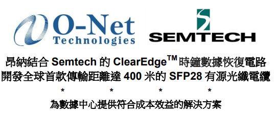 昂納主席兼行政總裁那慶林先生表示:「我們非常高興能與Semtech攜手開發(fā)出行內(nèi)突破性的SFP28 AOC,它超越了現(xiàn)有SFP28 AOC的傳輸距離限制。我們致力開發(fā)創(chuàng)新產(chǎn)品不僅為業(yè)務(wù)帶來協(xié)同效益,更有助本集團鞏固為新一代數(shù)據(jù)通信網(wǎng)絡(luò)系統(tǒng)開發(fā)光學網(wǎng)絡(luò)元器件的領(lǐng)導(dǎo)地位。我們將在可見將來尋求與更多世界領(lǐng)先技術(shù)解決方案供應(yīng)商合作?!?