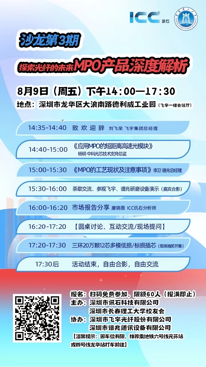 2024年8月9日下午,ICC訊石沙龍第3期《探索光纖的未來—MPO產(chǎn)品深度解析》將圍繞MPO技術(shù)的產(chǎn)品結(jié)構(gòu)、產(chǎn)品生產(chǎn),以及MPO市場(chǎng)緊缺性、工藝創(chuàng)新性,結(jié)合應(yīng)用案例及最新進(jìn)展進(jìn)行互動(dòng)探討。誠(chéng)邀廣大光電連接器、網(wǎng)絡(luò)工程、技術(shù)解決方案及數(shù)據(jù)中心互聯(lián)專家及人士免費(fèi)報(bào)名參加,名額有限報(bào)滿即止哦。