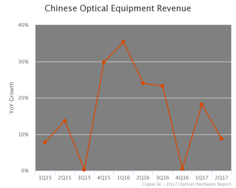 1. 2017年上半年,中國光網(wǎng)絡(luò)設(shè)備市場(chǎng)同比增長(zhǎng)13%。器件商的疲軟主要是由于持續(xù)的庫存調(diào)整(主要是華為),并非終端市場(chǎng)疲軟信號(hào)。