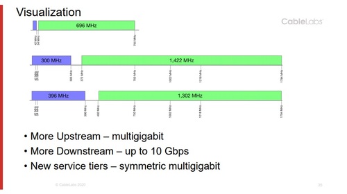 上圖幻燈片說明了當今采用750MHz部署的有線電視運營商如何通過將頻譜上限提高到1.8GHz來擴展容量,以及如何利用新的分流方式來極大地擴展專用于下行流量(以綠色顯示)和上行流量(以紫色表示)的頻譜量。(來源:CableLabs)