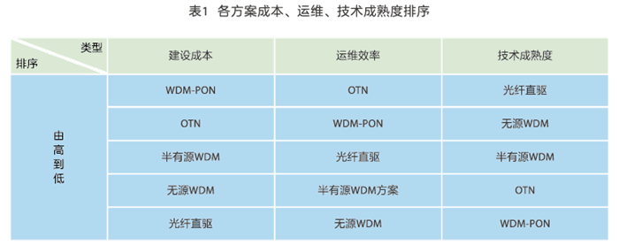 各種5G前傳方案架構(gòu)及優(yōu)劣勢對比如圖1所示,并從成本、運維、技術(shù)成熟度幾方面對各方案進(jìn)行排序,見表1。
