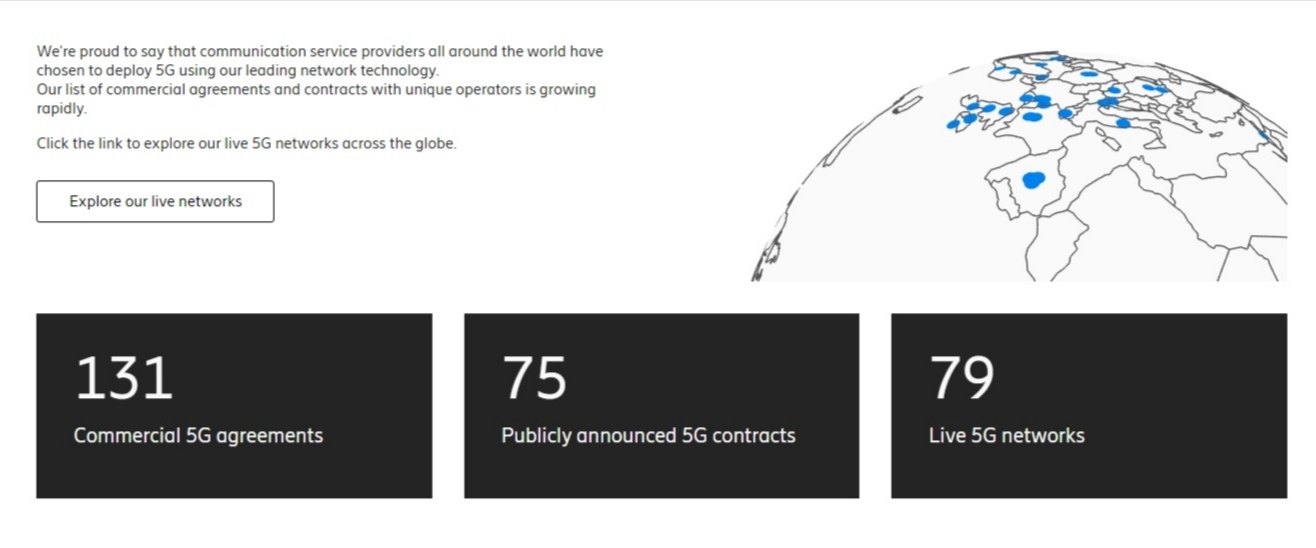 ICC訊 愛立信官網(wǎng)公布的數(shù)據(jù)顯示:截至目前,愛立信已經(jīng)在全球斬獲131個5G商用合同,其中愛立信已經(jīng)與75家運營商客戶達成可公示的5G商用合同,目前在40個國家為79個已經(jīng)正式運行的5G商用網(wǎng)絡(luò)提供設(shè)備。