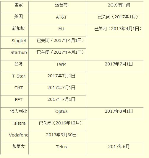 截止2017年7月1日確認(rèn)的已關(guān)閉或即將關(guān)閉2G網(wǎng)絡(luò)的漫游地合作運(yùn)營商如下: