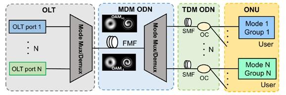圖2OAM空分復用和時分復用結(jié)合的混合無源光網(wǎng)絡(luò)